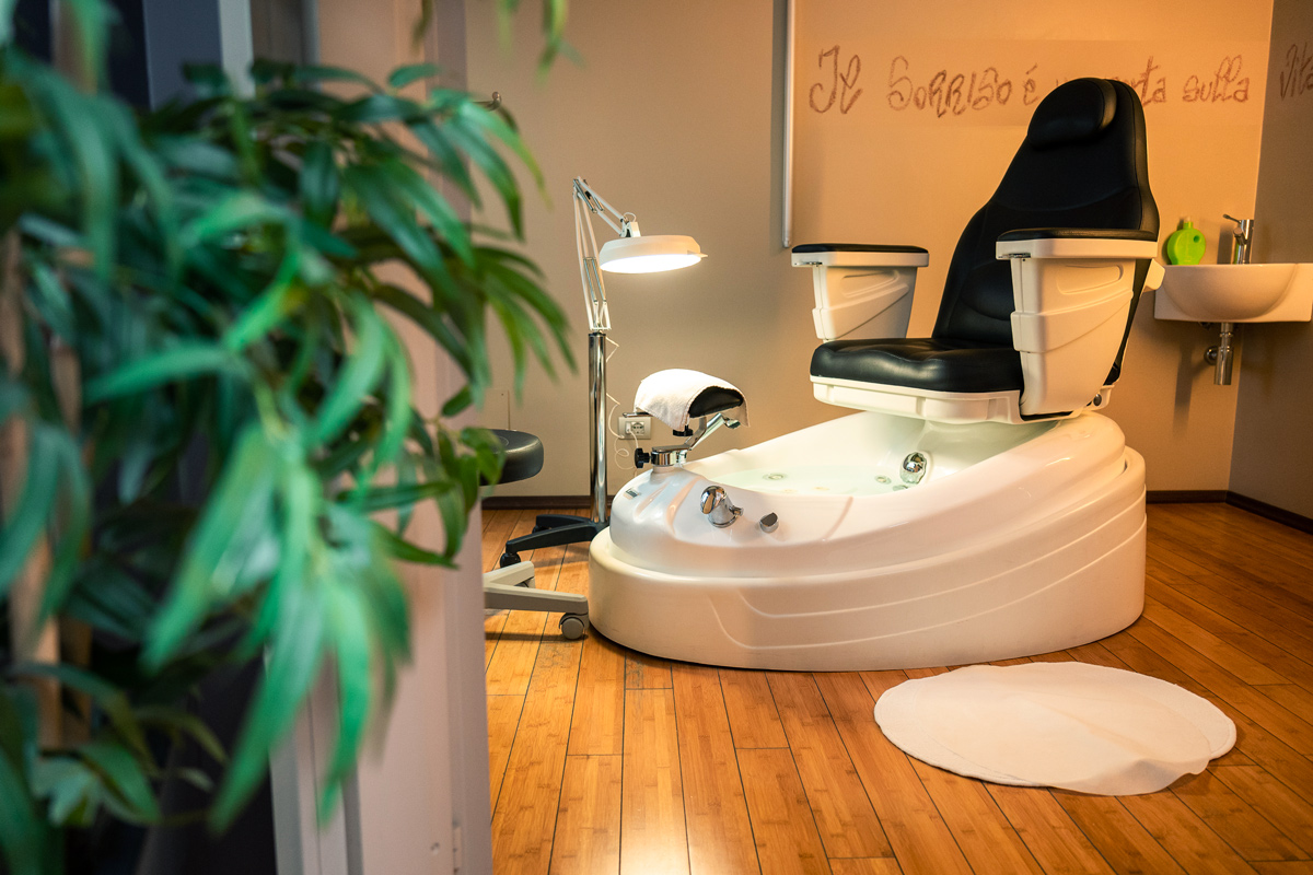 Idromassaggio con sali minerali, cura delle cuticole, delle unghie, dei cali e dei talloni, limatura, scrub, massaggio e applicazione smalto: Disponibile anche con smalto semipermanente.